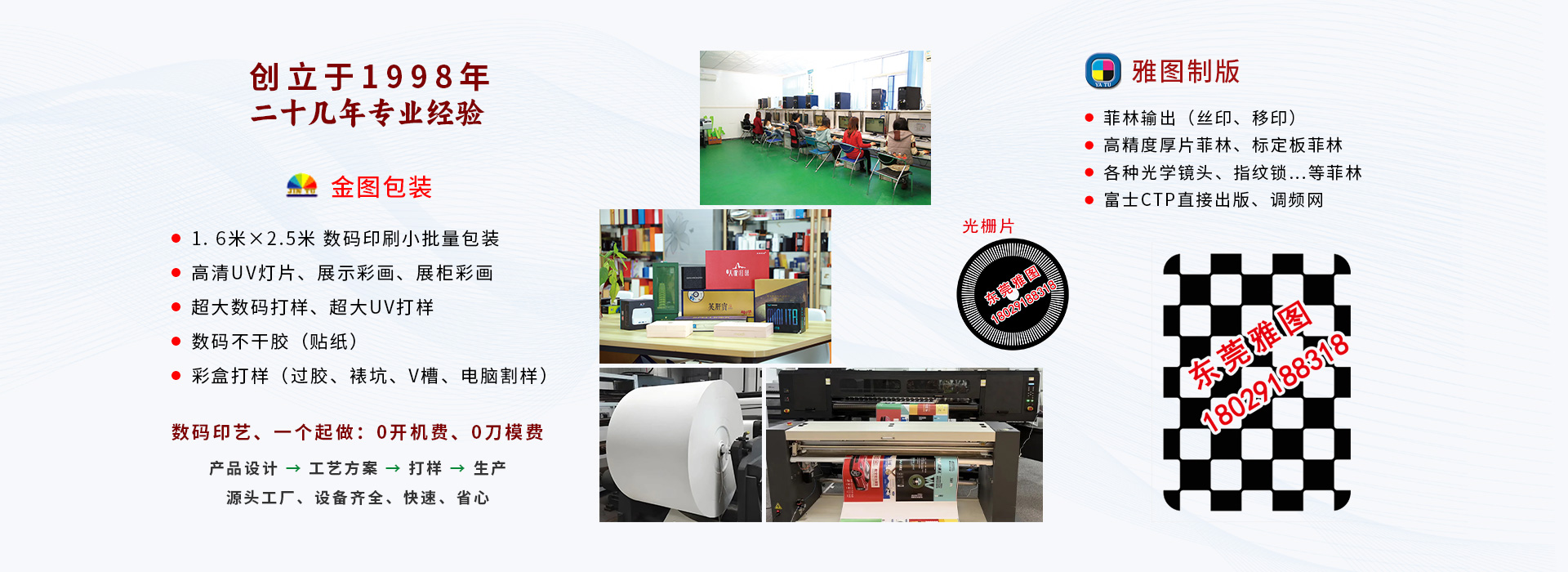 电脑文件到彩盒成品,一站式完成,一个起做,快捷方便,省去上机印刷,做刀模板等传统工序,8台大数码打样设备,速度快,效率高。数码快印/不干胶半穿